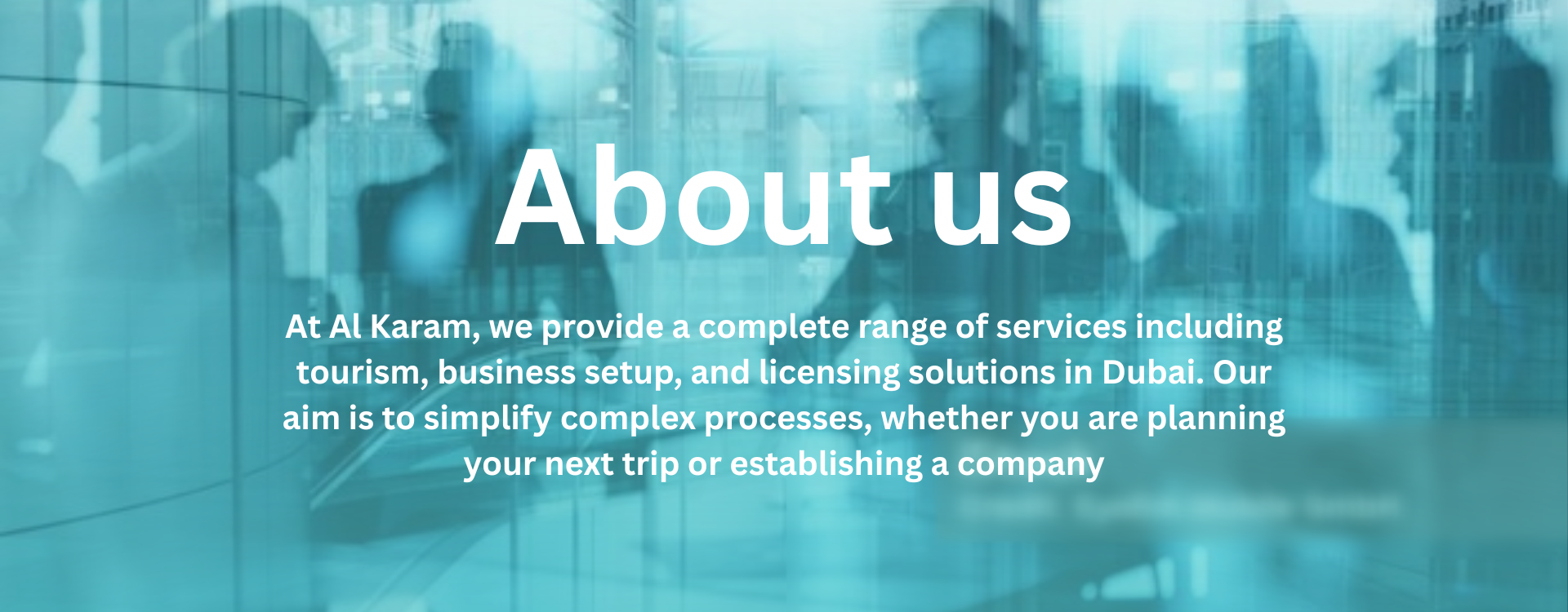 AL KARAM tourism & Business Men Services is an establish and emient Business setup consultancy based in Dubai & Sharjah.We provide all the necessary in connection with company formation and operation in UAE.Our Business services in UAE includes findings a sponser,trade licence services,pro services & all kind of Visa services